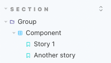 On the left, you see the navigation that helps you find the right components. It's a file tree with all your components and stories. A component can have multiple stories: all the different versions or states of the component. It can be structured using sections (optional), then optionally grouped by anything you want (like component types or parent), and then you’ll have the components.